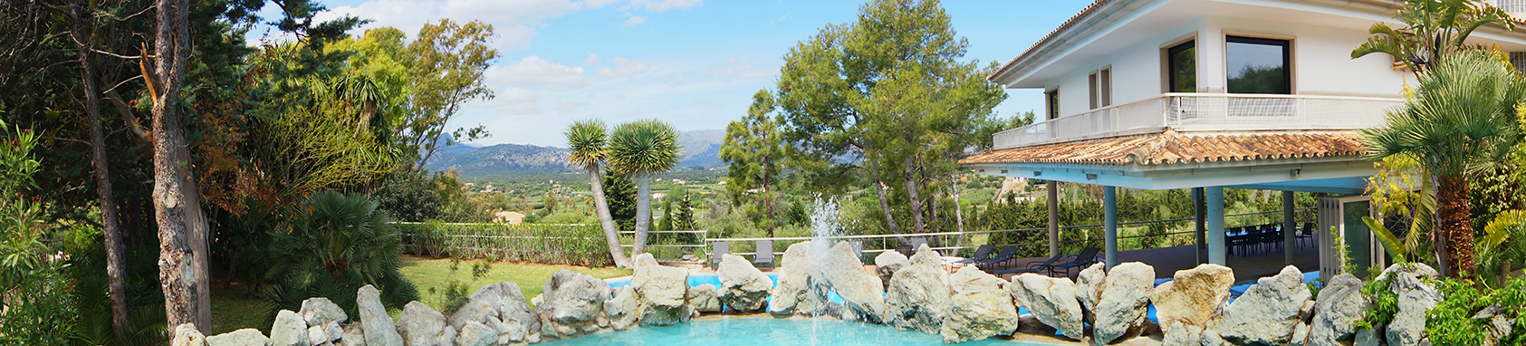 Our main house is located on a beautiful estate. It overlooks the spectacular bays of Alcúdia and Pollensa in the northeast of the stunning island of Mallorca. Inside, it offers a spacious living area and both an indoor and outdoor pool. There is a majestic landscaped setting and a variety of spots to relax. It has its own orchard where we harvest our seasonal organic vegetables. There are several trees that bear fruit throughout the year.