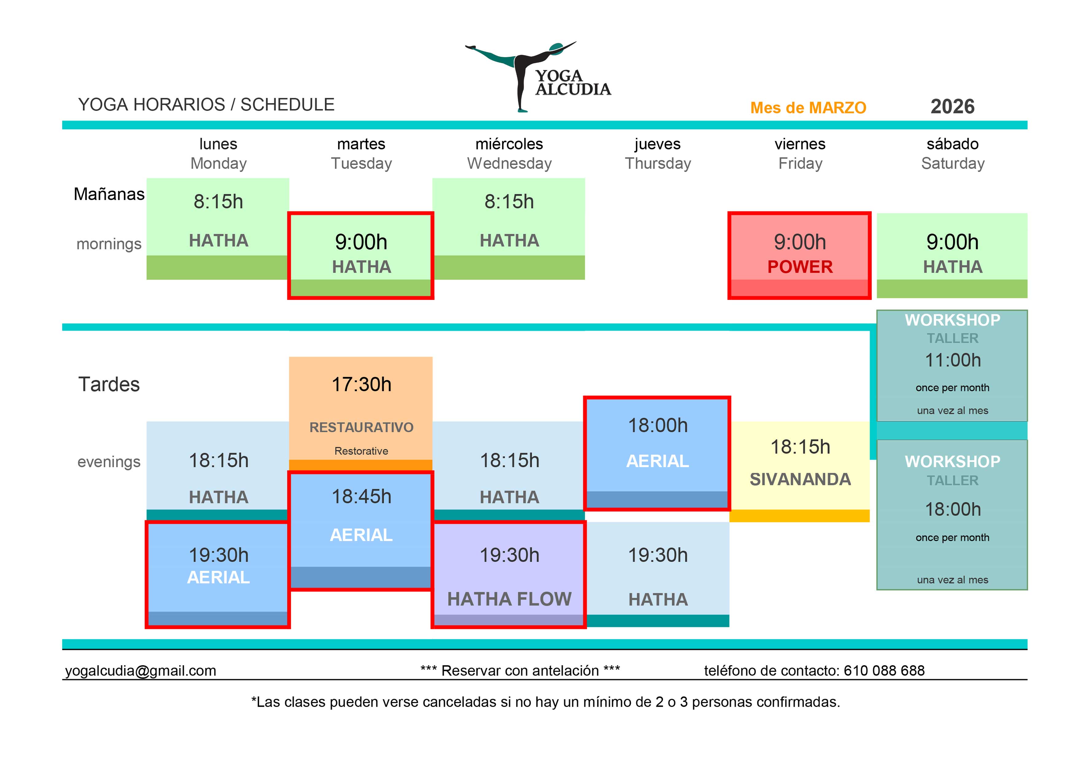 Las clases de Yoga Playa y Supyoga pueden no realizarse si no hay un mínimo de 3 personas.